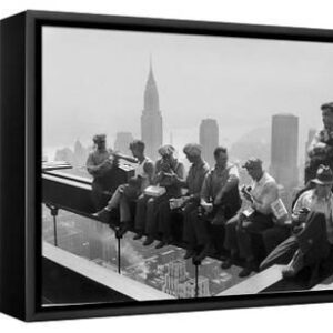 Construction Workers Take a Lunch Break on a Steel Beam Atop the RCA Building at Rockefeller Center - Black Framed Canvas Print Wall Art, 16x12